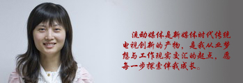 2008年7月就职于新华社新闻信息中心多媒体选编供稿部,从事部门内部行政工作。现任职于新媒体发展部网络视频室,担任电视新媒体业务主管。与各类流动媒体公司合作,囊括户外大屏幕,公交、地铁、火车车载电视,楼宇电视,机场大屏幕等多种终端,有针对性地提供视频、文字、图片等各种形式的新闻信息产品。