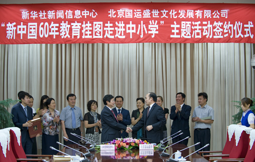 8月27日,"新中国60年教育挂图走进中小学校园"主题活动赞助签约仪式在新华社新闻大厦举行。新华社新闻信息中心主任张晓华和活动赞助方北京国运盛世文化发展有限公司董事长李昕昊代表合作双方签约。