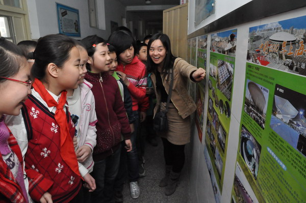 校园内,老师为大家讲解世博挂图内容,丰富学生们校园生活。